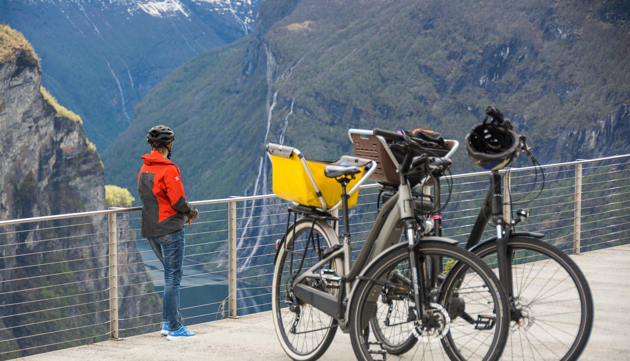 Disfruta! Recoje tu bicicleta electrica en la Oficina de Boletos (Ticket Office) en la Información Turistica de Geiranger.