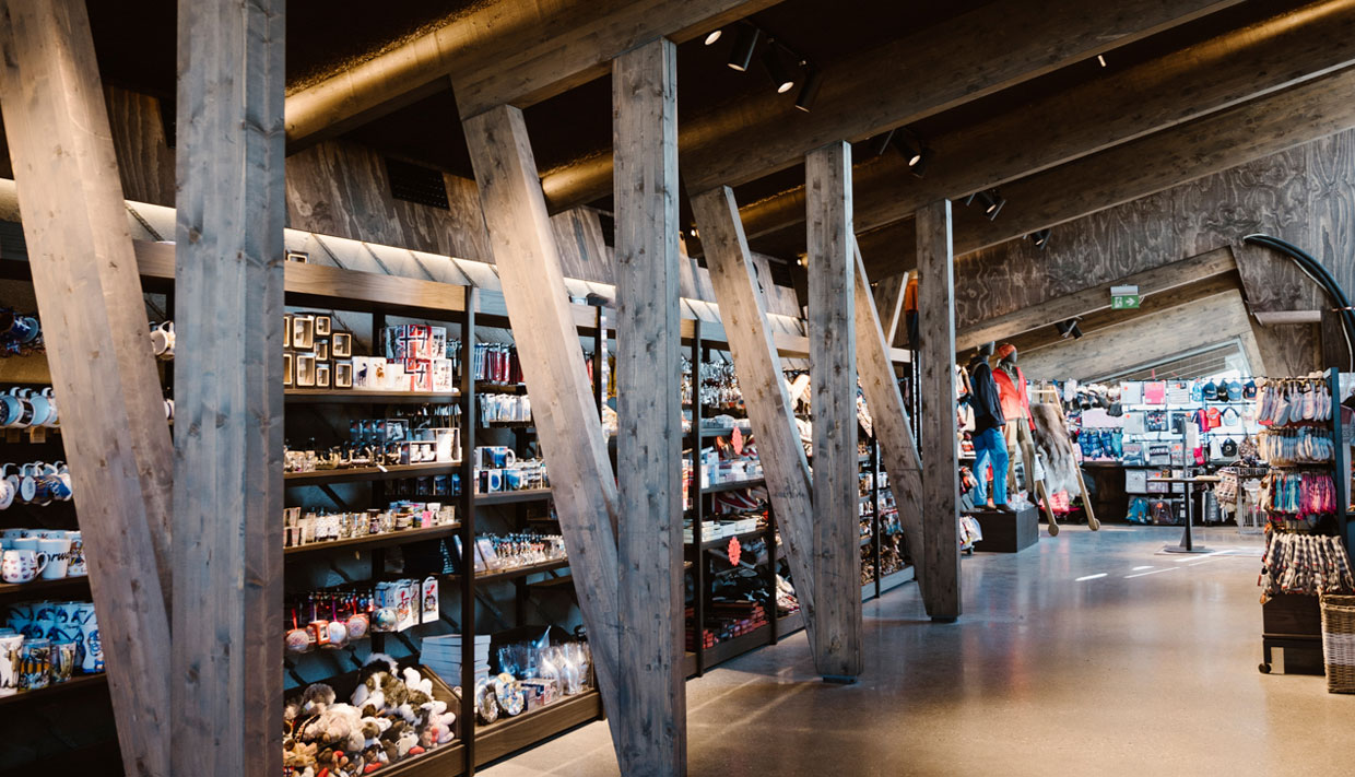 - Geiranger Skywalk Shop, salg av suvenirer, Skogstad-bekledning, ull fra Devold og kioskvarer.