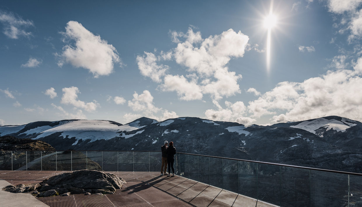 Her kan du stå på en fjelltopp, trekker inn frisk fjelluft og nyt utsikten over snødekte fjell, Unescos verdsarvsområde og Geirangerfjorden. Alt dette og mer til, kan du få oppleve på Dalsnibba. Og vet du hva? Du trenger ikke gå et eneste skritt.