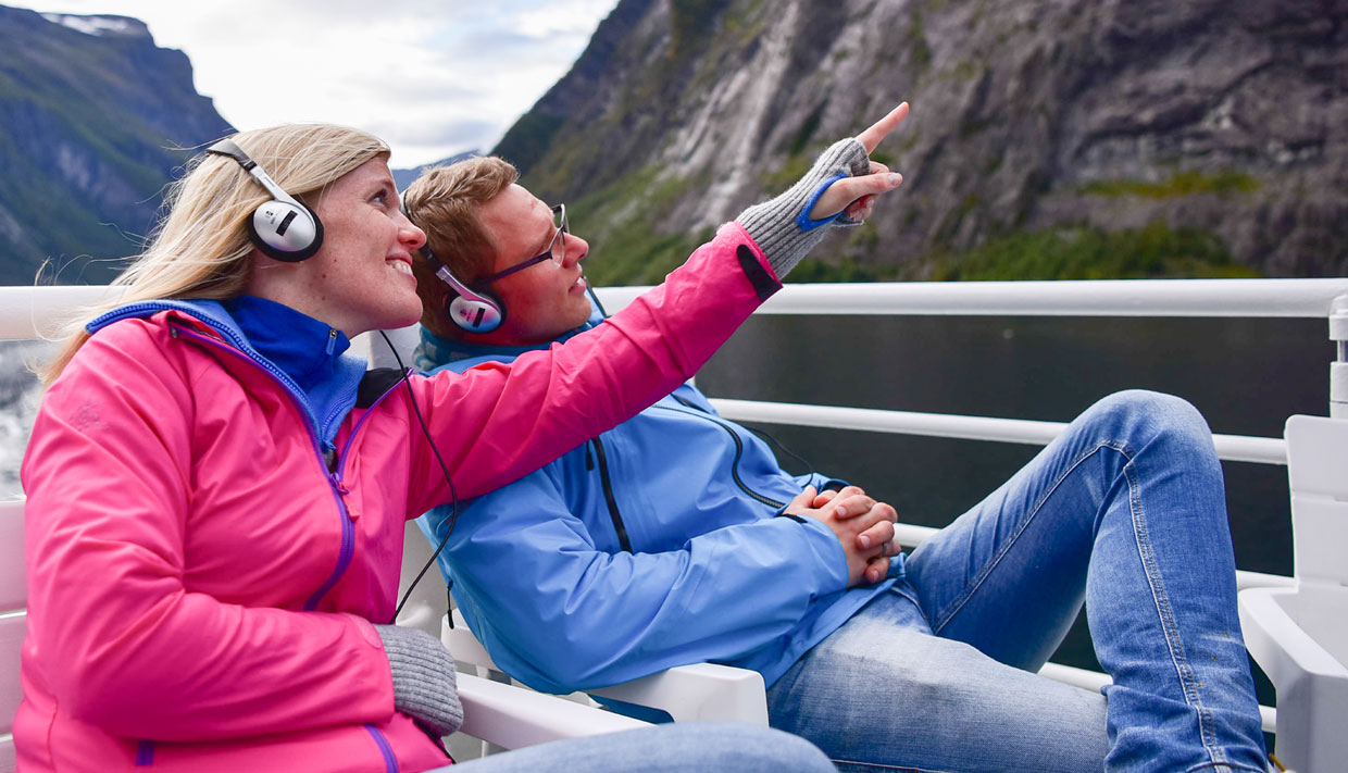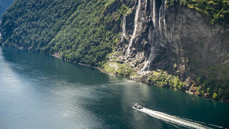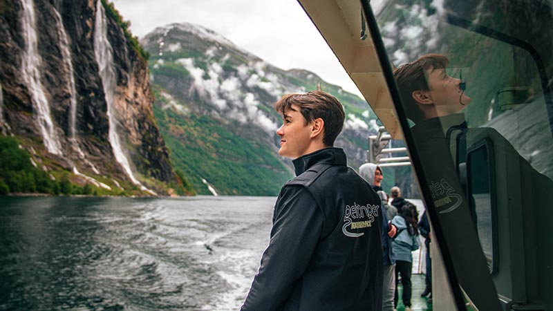 Båten kjører helt inntil fossefallene De Syv Søstre, Friaren og Brudesløret. Du vil også kunne se de fraflyttede fjordgårdene som Skageflå, Knivsflå, Blomberg og Matvik, og høre historier om de som en gang bodde der.