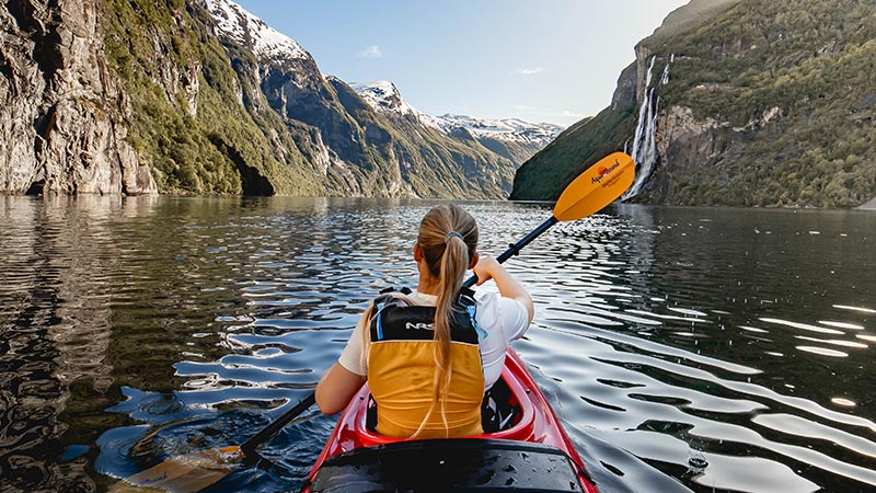 Dette er en guidet kajakktur som lar deg oppleve Geirangerfjorden og dens spektakulære fossefall. Turen starter ved kajakksenteret ved havnen i Homlong og går nedover fjorden til vi kommer midt mellom de to berømte fossene De Syv Søstre og Friaren. Her får du virkelig oppleve fossene på en unik måte.